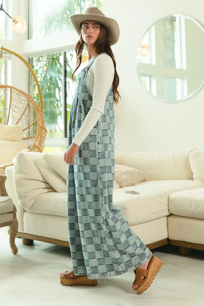 These washed vintage checker wide legs overalls are a stylish and nostalgic addition to your wardrobe. With a unique pattern and wide leg design, they are sure to make a statement. Pair them with a simple top for a fashionable and comfortable look. Perfect for casual outings or creative styling, these overalls are versatile and fun.