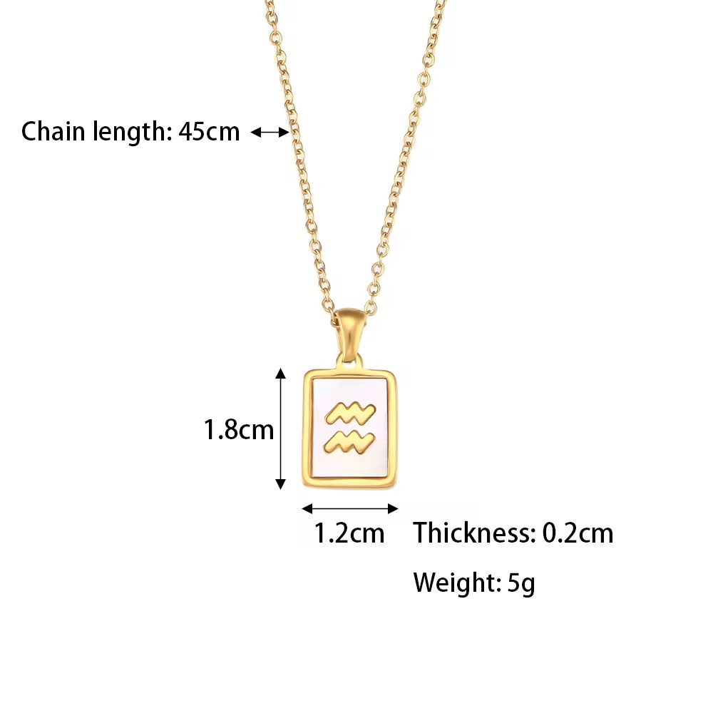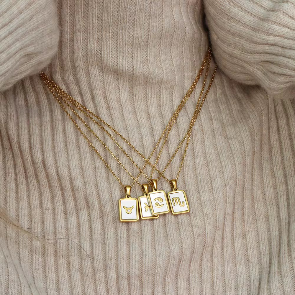 “18kt plated stainless steel zodiac necklace. Tarnish resistant and water-resistant”.